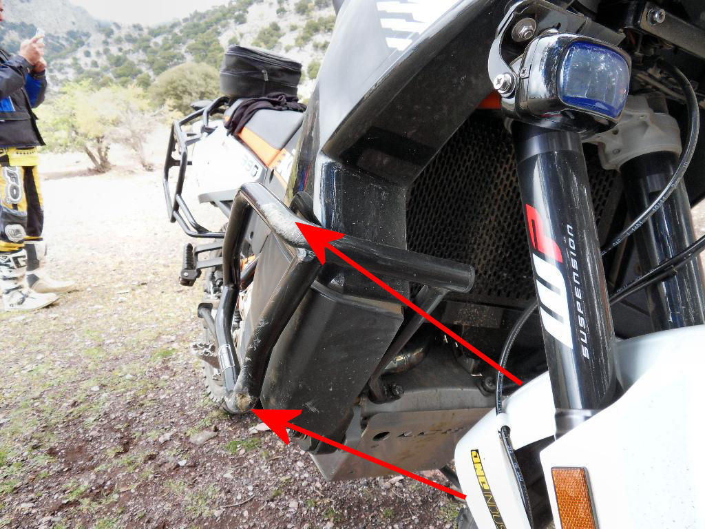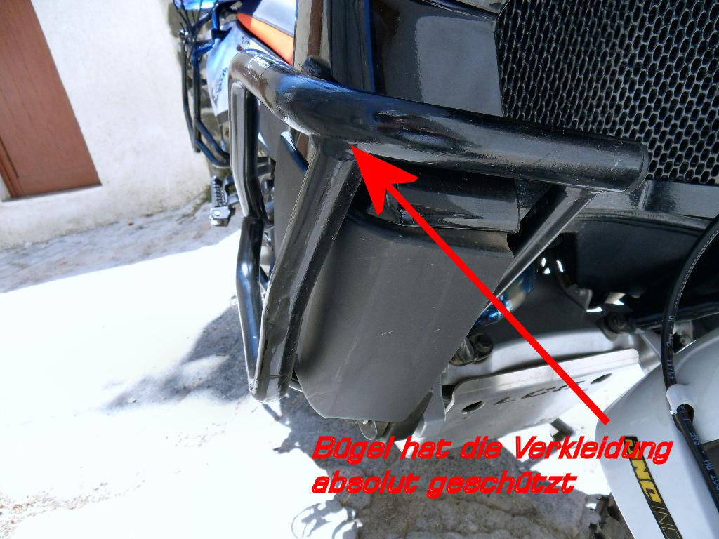 Ich möchte nicht wissen, wie die Stelle und der Rahmen ausgesehen hätten, hätte ich den TT, oder den KTM Bügel mit den Krallen dran gehabt . Ich vermute, dann wäre der Rahmen verbogen gewesen....die Verbindung Bügel-Rahmen ist zu starr und fest. Beide SW-Motech Bügel haben den Schlag gut absorbiert und haben den Rahmen nicht beschädigt.