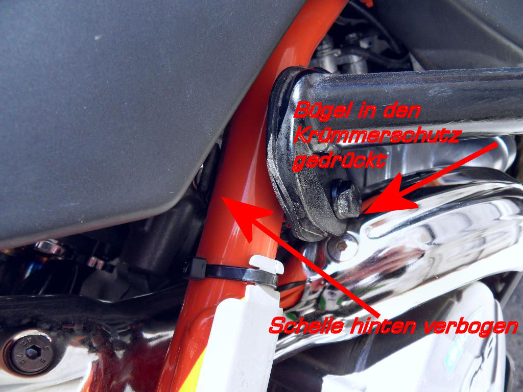 Ja, der ganze Bügel war in sich verbogen (die Befestigungs-Schraube vorne war nicht verbogen). In beiden Fällen. Auch in beiden Fällen hat sich die Schelle, die den Bügel hinten am Rahmen fest macht, aufgebogen und der Bügel ist etwas nach unten gewandert....hat aber den Rahmen nicht beschädigt (nur in dem einen Fall etwas den Krümmerschutz eingedrückt). Etwas Farbe war am Rahmen abgekratzt, durch das wandern des Bügels beim Aufschlag, nicht der Rede wert.
