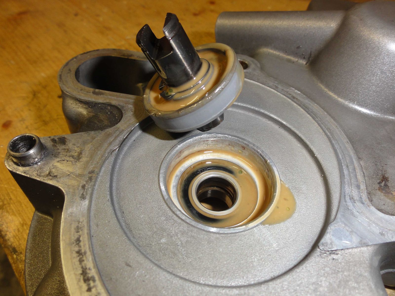 Das Öl-KühlFlü Gemisch sah bei mir GENAU SO aus (gelbbrauner Schlaz), sammelt sich auch gerne an der Innenseite des Kupplungsdeckels. Fett kann nur von der Montage des Dichtrings kommen, aber nie in solchen Mengen ausserdem sollte das Silikonfett sein (weißlich/durchsichtig). Ich würde Welle und Lager auch tauschen, dann hast wirklich Ruhe. Das die Welle keine Laufspuren hat und trotzdem die Dichtung undicht ist macht mich stutzig (meine hatte unter dem Dichtring schon eine schöne Rundfräsung). Sicher dass du beim Einbau alles richtig gemacht hast?