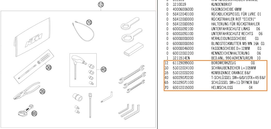 Hab ja meine 990er Adventure ABS (Bj. 2012) gebraucht gekauft, und ich vermute mal, dass da das Bordwerkzeug mal mit dem von anderen ADV's durchgemischt wurde und deswegen nicht mehr in der originalen Zusammensetzung bei mir ist.
