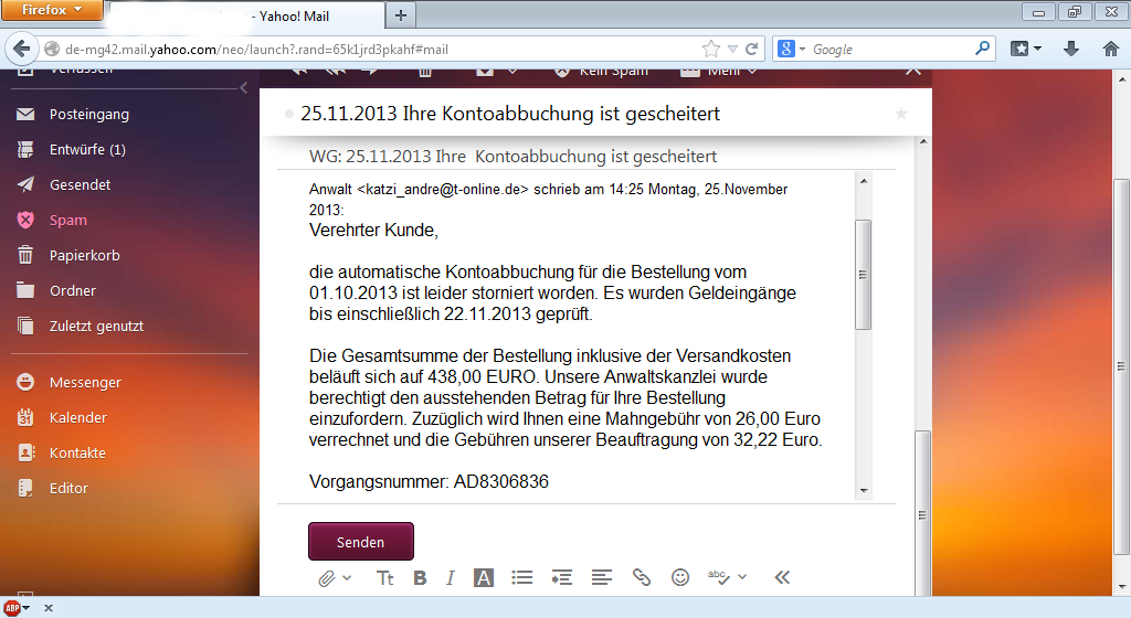 Ja, ganz übel ist das die letzten Monate. Bekomme ein gefälschtes Schreiben nach dem anderen. Paypal (gleich bei täuschung@paypal.de gemeldet), Abmahnschreiben von Pseudo-Anwälten per Email, redtube Abmahnung per Email (die Geschichte ist eh der helle Wahn ) etc.....!
