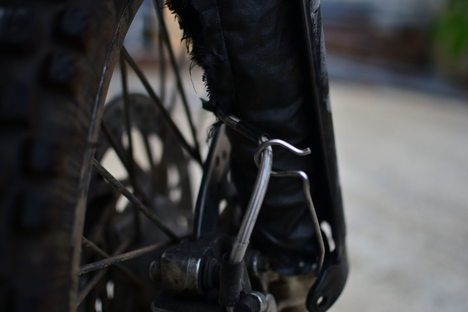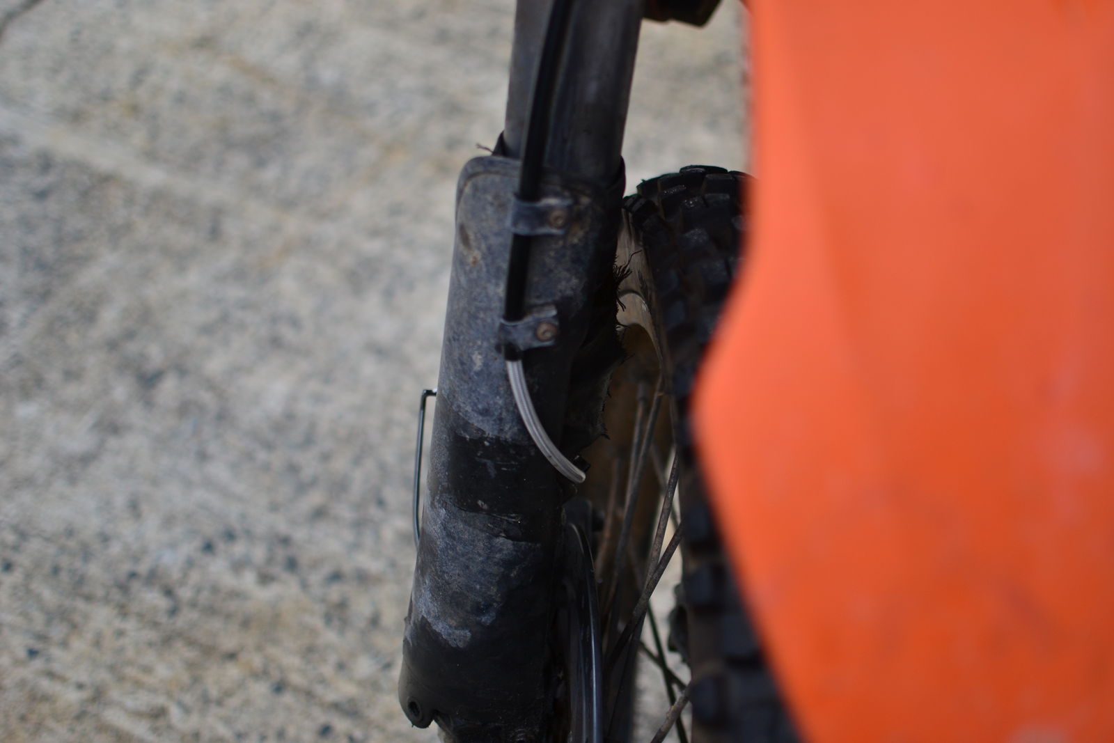 - Du mußt auf dem rechten Gabelschützer die Bremsleitung so fixieren, daß sie da nicht durchrutscht. Bei meinem Eigenbau gibt es diese beiden Führungen wie auf Deinem Foto garnicht, da reichen zwei Bohrungen durch den Gabelschützer mit einem kräftig angezogenen Kabelbinder.
