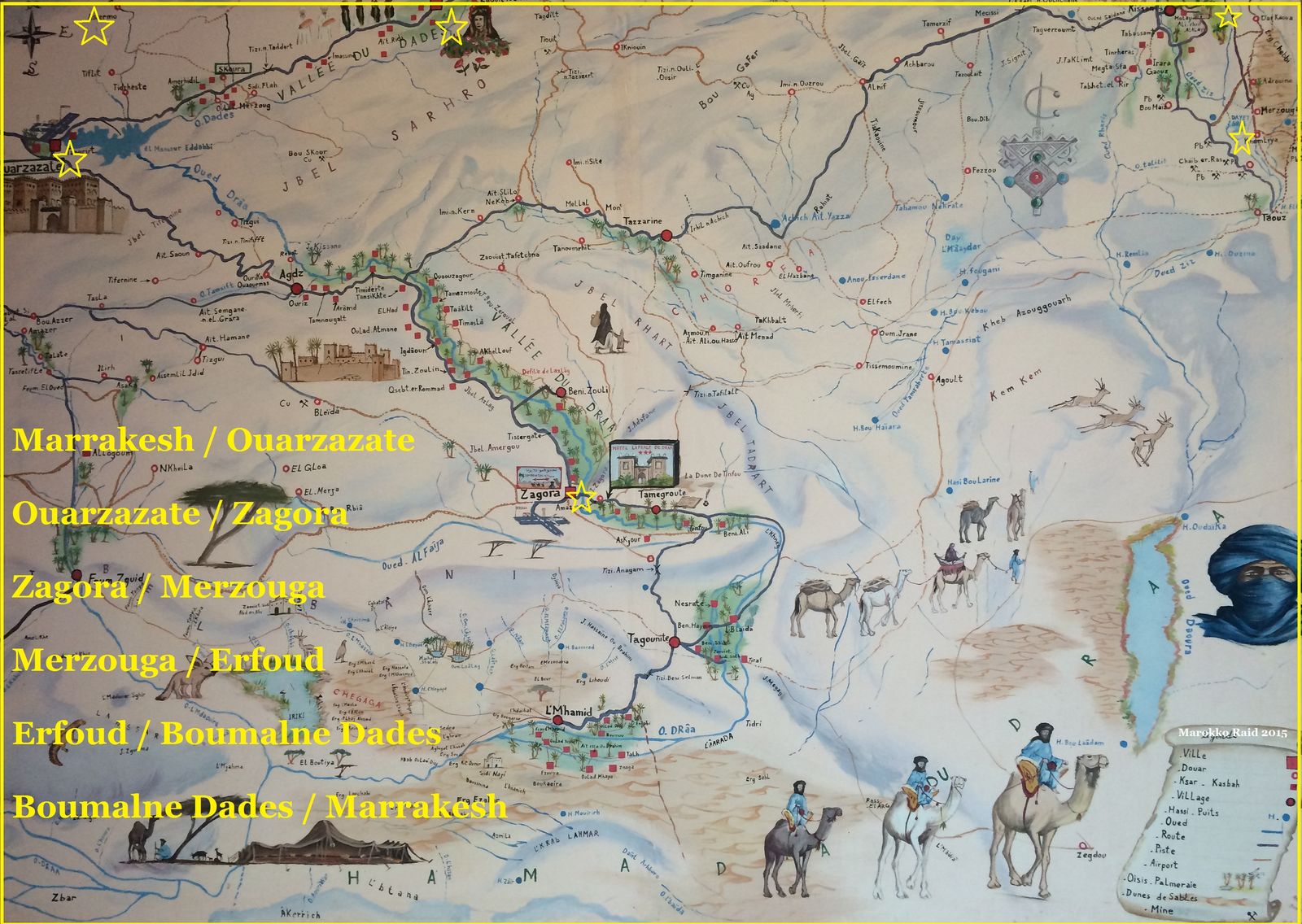 Start ist in Ouarzazate. Die Strecke führt dann durch den Südwesten Marokkos, um am letzten Tag in Marrakech zu enden.
