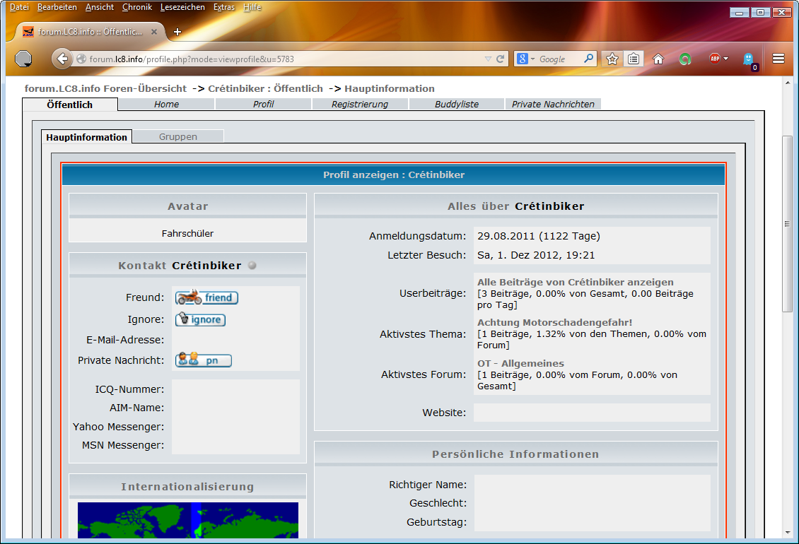 Habt Ihr nicht gerade ein Treffen gehabt...ich denke die Verunglimpfung kam mit höchster Wahrscheinlichkeit aus einem Gebiet mehr (!) als 2000km nördlich von hier aus gesehen (wie auch schon der 2te Beitrag dieser unseligen Figur "Cretinbiker"), möglicherweise ganz aus der Nähe wo Ihr Euch getroffen habt, ohne dass ich jetzt dabei die Veranstalter/in und die meisten Teilnehmer beschuldigen, verdächtigen oder sonst wie verunglimpfen will (einige der Teilnehmer kenne ich sogar persönlich und für die lege ich meine Hand ins Feuer!).