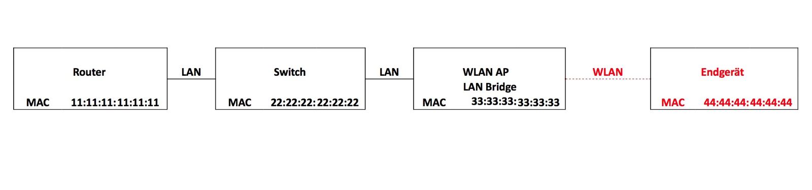 33:33:33:33:33:33 - weil der AP seine MAC durchleitet und laut seiner Tabelle den Datenstrom verteilt oder wird die 44:44:44:44:44:44 vom Endgerät durchgeleitet ???