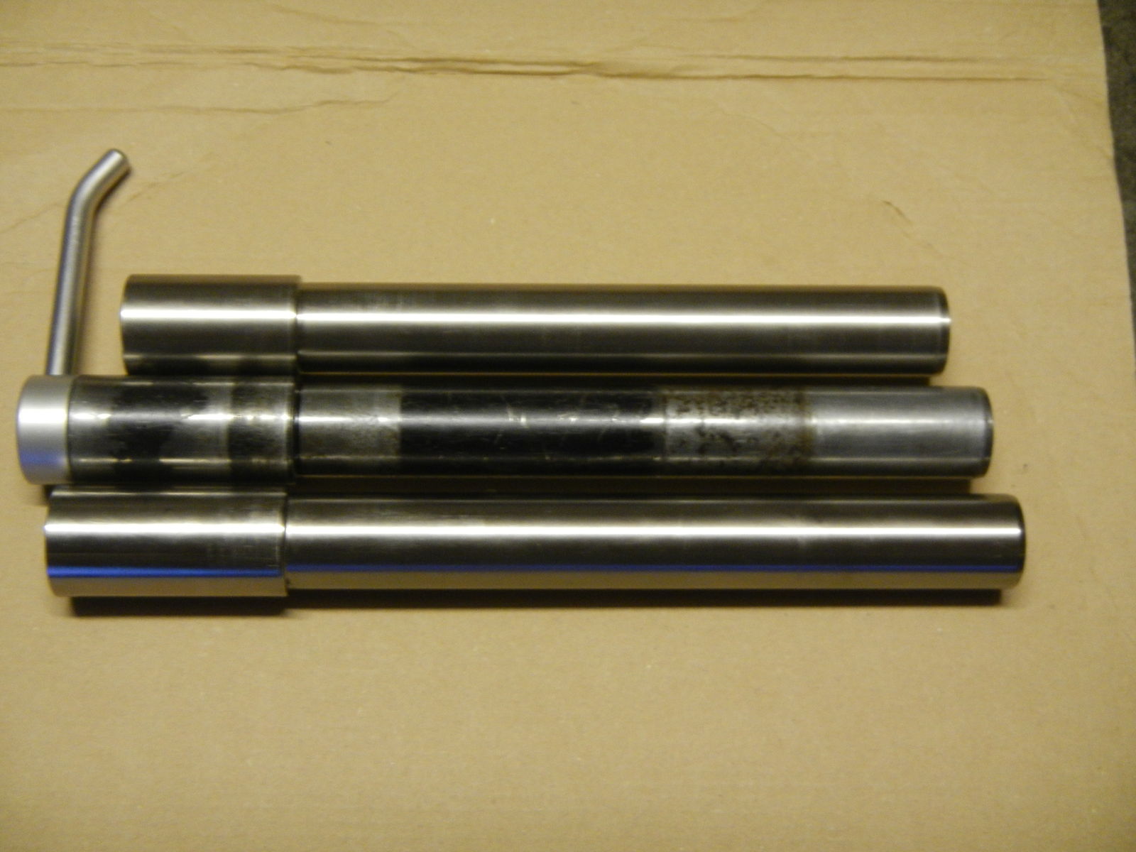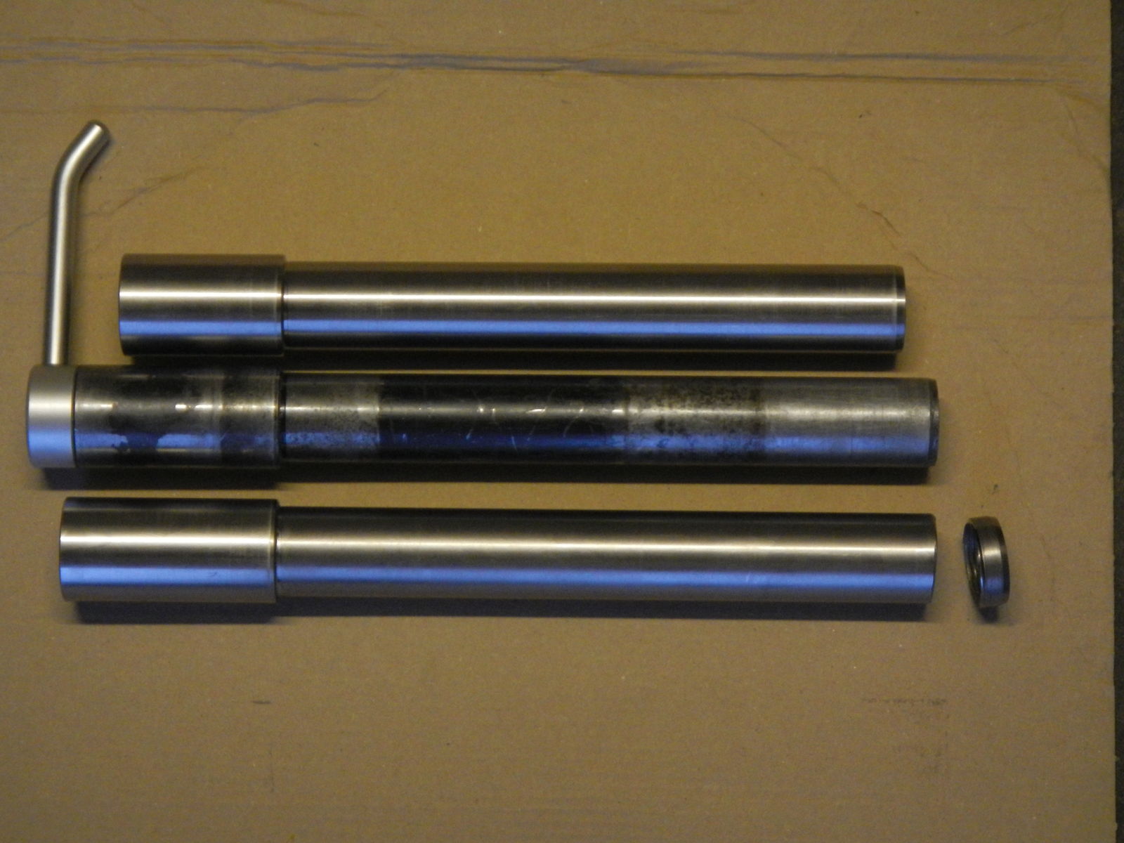 sauber abgelängt. Vor der Montage des Steckachsenausziehers würde ich mal die Durchmesser genau ausmessen. Nach meiner Erfahrung ist der Auszieher aus den KTM-Powerparts immer minimal zu dick. Beim Reinschlagen ins Achsende werden Späne abgehoben. Ich habe vorher immer ein paar Zehntel vom Umfang abgeschliffen. Versau´ Dir das Achsgewinde nicht beim Reinschlagen des Ausziehers, am besten senkrecht auf eine Holzplatte stellen.