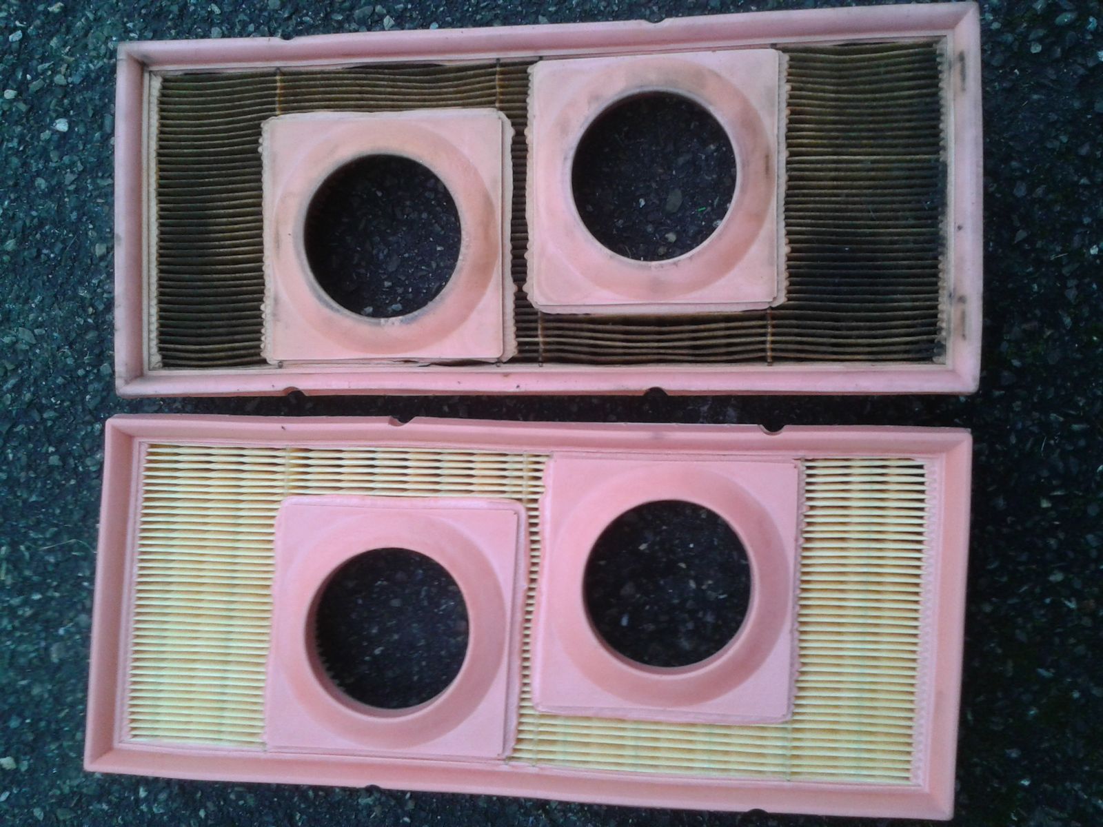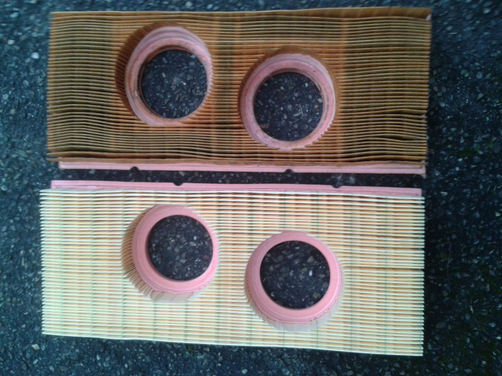 schaust Du Dir eines der Luftfilterelemente an, sind natürlich die beiden Löcher zueinander versetzt, passend zum Zylinderversatz und damit auch zum lateralen Vergaser- resp. Drosselklappenversatz. Legst Du beide Filterversionen nebeneinander, siehst Du, daß die beiden Löcher für die EFI-Drosselklappengehäuse nochmal etwas anders sitzen als die beiden Löcher für die Vergaser. Man kann natürlich ein EFI-Element auf die Vergaser zwingen und umgekehrt. Es könnte allerdings ungefilterte Luft durchkommen am Rand von Vergaser resp. Drosselklappengehäuse. Zur Not kann man das sicher machen, aber wenn man beim Händler nebenan das genau passende Teil bekommt...
