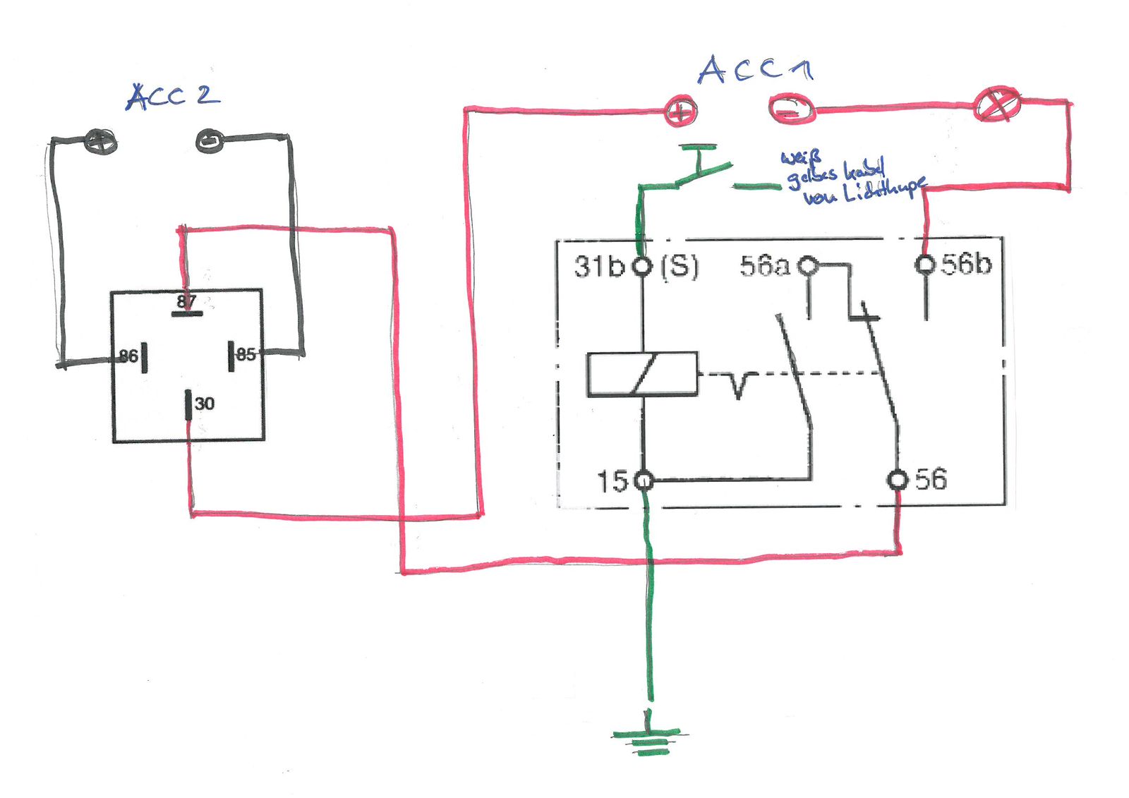 kann auf Anhieb keinen Fehler im Schaltplan erkennen. Welche Leistung ziehen Deine Zusatzleuchten? Für welche Leistung ist das Stromstoßrelais ausgelegt? Vielleicht entsteht beim Abfallen (2.Stromstoß) ein Abrißfunken, die Spannungsspitze läßt die ACC2-Sicherung durchbrennen. Möglicherweise trennt das Relais zu langsam. Nur ´ne Idee... Zum Testen einfach mal einen kleineren Verbraucher anstelle der Leuchten, oder nur eine der Leuchten reinhängen.