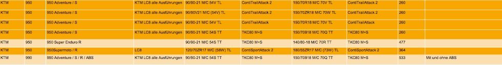 Bei KTM lese ich nur MT90 und Scorpion Trail von Pirelli sowie den TKC80 von Conti. Bin ich zu blööde?