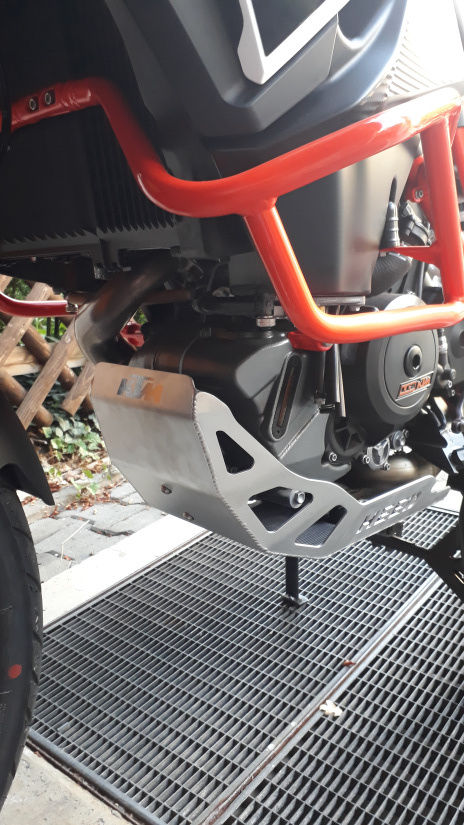 ich habe derzeit an meiner 1290SA Motorschutz von HEED in der Ausführung Alu silbern (da unbehandelt) montiert und bin überaus zufrieden mit dem Preis-Leistungs-Verhältnis. Montage mittels zweier gepulverter Stahlbügel. Der vordere wird da montiert, wo auch der Serienplastikschutz dran ist. Der hintere nutzt dieselben Bohrungen wie der Motorschutz aus den KTM-Powerparts. Paßgenau gefertigt. Gewicht 1,85kg. Der vordere Krümmer wird gut geschützt. Schnell und ohne Frickelei demontierbar bei nur vier Schrauben. Alle in M8, wenn ich mich recht erinnere - habe sie wegen Optik und Bordwerkzeug durch originale KTM-Schrauben (SW10-Sechskant+Torx) ersetzt. Die Aluschale könnte im hinteren Bereich etwas länger sein für besseren Schutz der Krümmer bis zum Kat, aber dann würde sie vermutlich schwingen und dröhnen. Für mein gelegentliches Fahren auf Schotterpisten und breiteren Waldwegen vollkommen ausreichender Schutz - z.B. gegen vom Vorderrad hochgeschleuderte Steine - bei recht schlanker Optik und guter Belüftung des Krümmerbereichs. Meine Empfehlung! Von der Stahlversion würde ich abraten (Gewicht, Korrosion).