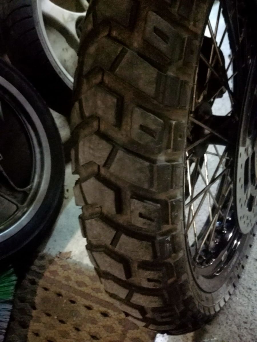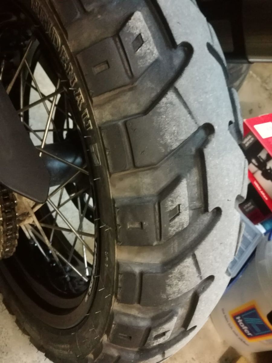 Der Vorderreifen ist einmal ein 90/21" und einmal ein 110/19". Beim Hinterreifen würde ich sagen ein 150/18" und ein 150/17".