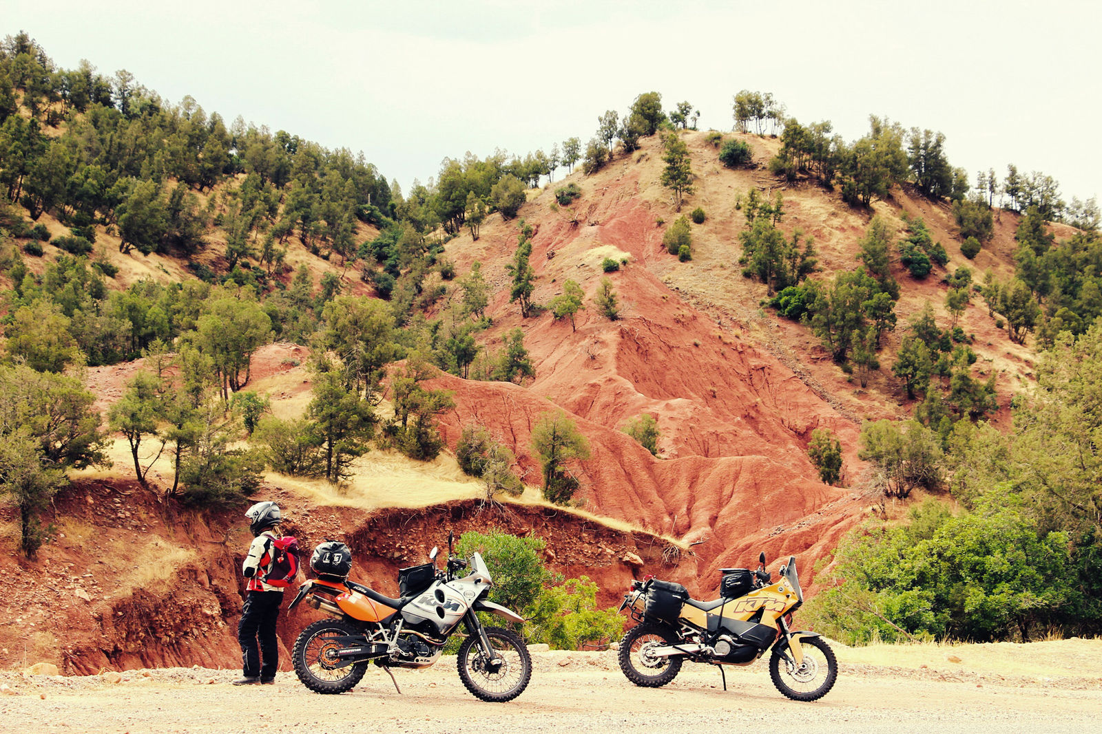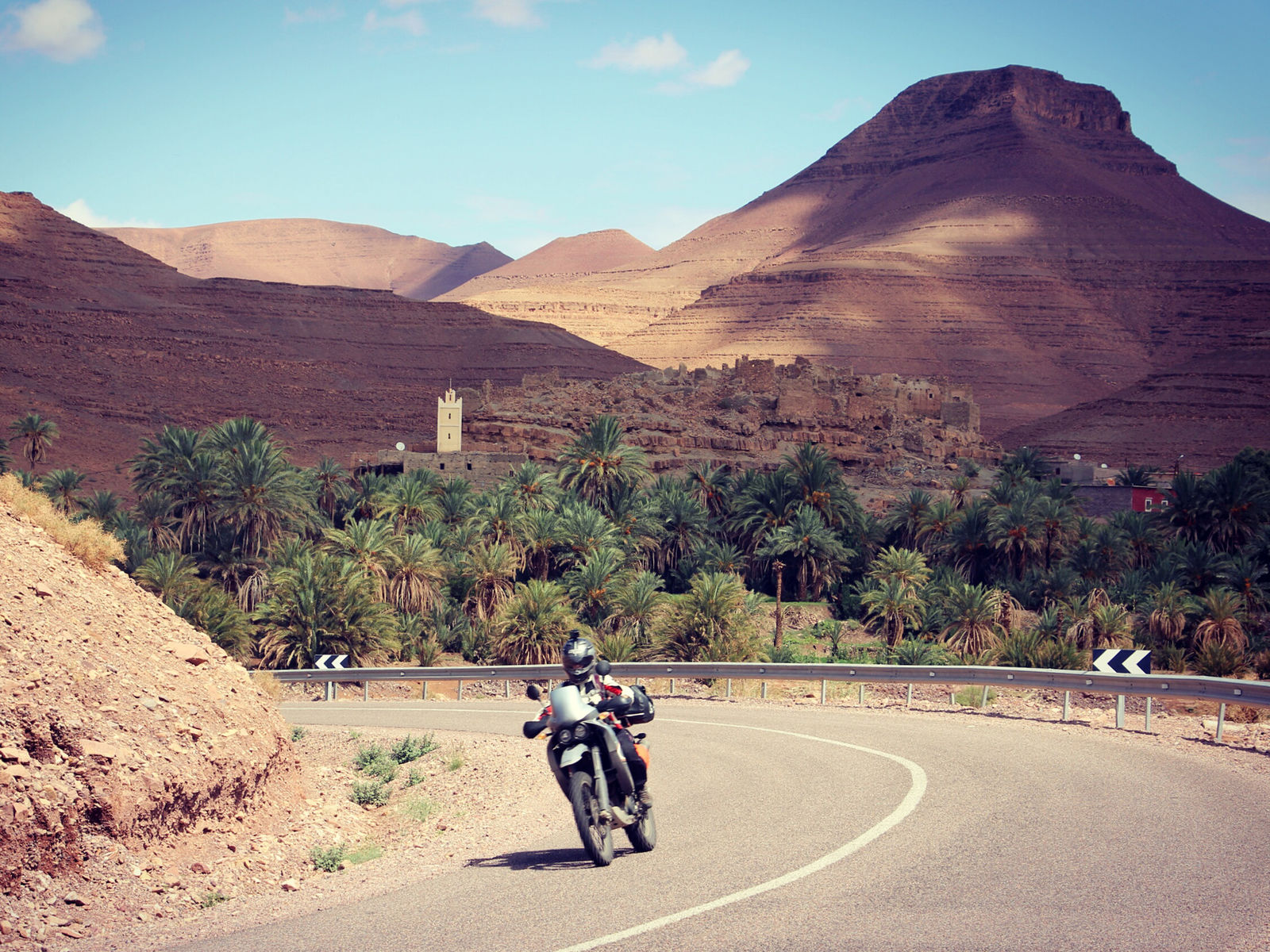 Kaum geschlafen, starke Kopfschmerzen und Abstieg. Gegen 10:30 im Dorf, Hubschreiber kreisen im Toubkal Gebiet, sicher eine Bergrettung. Zurück auf den Maschinen kündigen dunkle Wolken im Süden über den Bergen Regen an. Noch sind wir entfernt – aber wir müssen in diese Richtung. Heilfroh vom Berg unten zu sein. Wir folgen auf vielen Kurven dem Fluss Oued Nfis als starker Regen eintritt. Wir fahren durch kleine Berberdörfer. Arme sehr konservative Gegend hier, anhalten wollen wir nicht. Km-lang folgen wir einem westlichen SUV, irgendwie froh dahinter zu hängen. Vereinzelt sieht man Sturzfluten im von Dattelpalmen gesäumten Fluß münden. Wir überholen einen großen Radlader. 30min später stehen wir vor dem Ziel des Radladers. Mehrere Erdrutsche haben die Straße verschüttet. Viele Männer sind auf der Straße, verfolgen die Räumung. Man winkt uns als erstes durch. Irgendwann haben wir alle Pässe des Atlas hinter uns gelassen, fahren von 2100hm hinab und blicken in die Weite. Gelbe Steppe und roter Fels – auf einmal sieht alles nochmal anders aus, afrikanisch. Die Stimmung steigt, das Land fängt uns wieder ein.