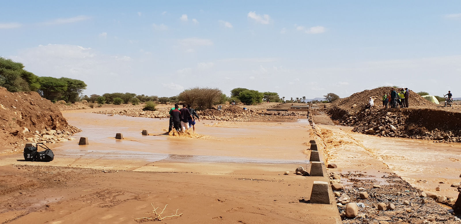 Am Morgen besuchen wir eine Schrauberwerkstatt in Zagora um für ein paar Dirham einen Sprüher Kettenfett zu erhalten. Hier steht eine Husky mit deutschem KnZ im Rallyetrim, Hecktank musste geschweißt werden. Die Werkstatt kommt mir bekannt vor, sicher aus dem Forum. Ich ziehe die LC4 auf den Seitenständer, der Bursche, der mir am Vortag eine komplette Dose für 600DH verkaufen wollte sprüht auf die Kette – die Dose ist kaputt es hört nicht mehr auf. Er hält die Hand drüber – zwecklos. Beim zweiten Anlauf, er sprüht - plötzlich KNACK – Seitenständer an der Aufnahme angebrochen. Fluchend baue ich ihn ab. Während des schweißen richtige ich noch eins, zwei Folgen eines Umfallers bevor wir in die vom Regen getränkte Wüstengegend aufbrechen. Ab jetzt bringt uns jeder km näher Richtung Heimat. Die Weite der Landschaft ist unglaublich. Piste lässt sich kaum fahren, zu viel Nässe und die Gefahr im Lehm stecken zu bleiben. Ich bin nicht gläubig aber für mein Fluchen will ich eine gute Tat tun und nehme ein Berber ca. 15km mit. Der arme Kerl, ohne Helm, Schlappen hat er nicht verloren. Die Flüsse sind angeschwollen. Wir haben viele Flussquerungen, auch welche bei denen ich vorher teste und mit nassen Füßen zurückkehre. Mehrmals bin ich Vortester für wartende Autos am Fluss. Alles geht gut.