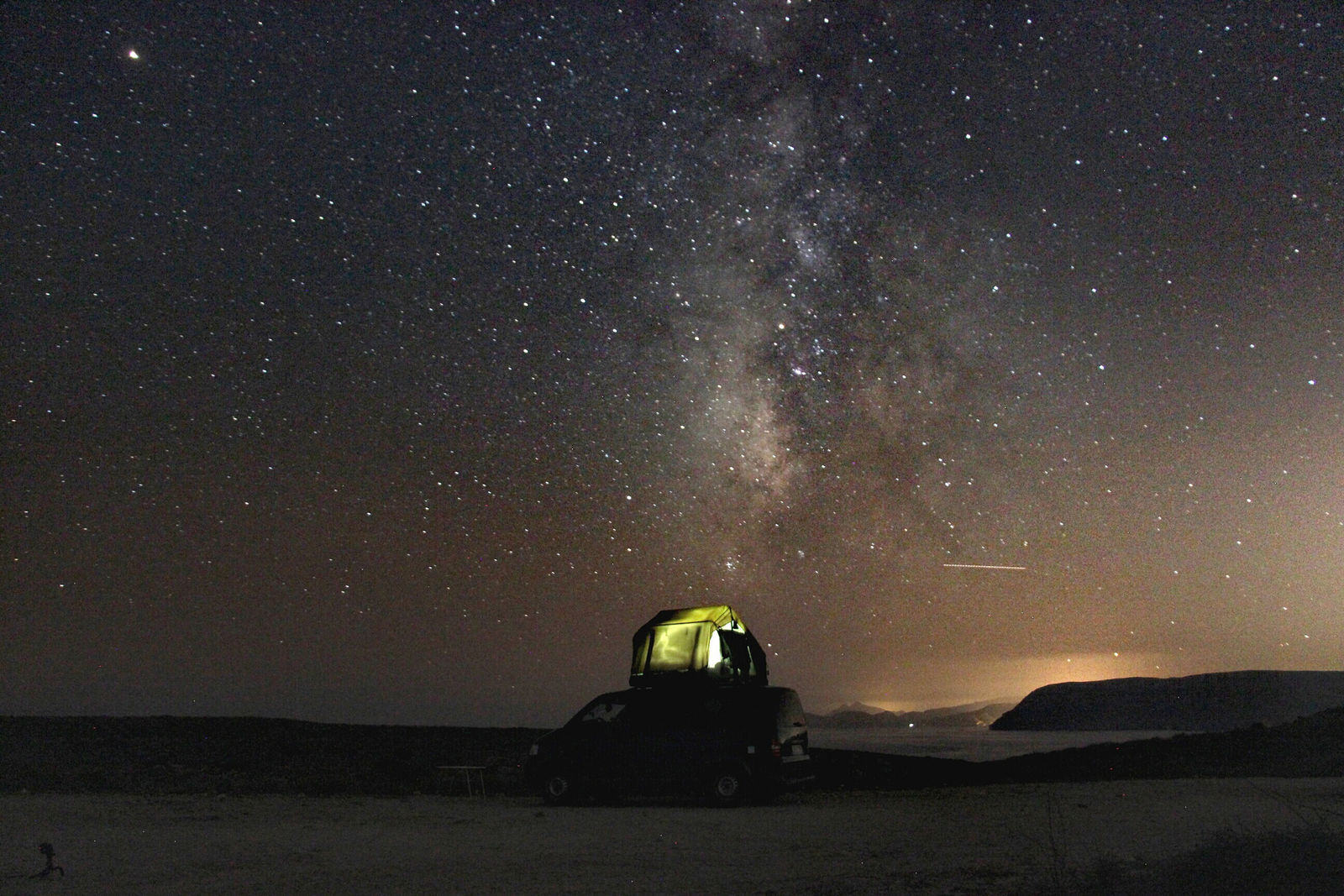 Der T5 ist mit allerhand Outdoor-, Küchen-, Überlebens- und Werkstattinventar sowie einer LC8 990 und LC4 640 gefüllt und obendrauf ist noch das Dachzelt gebunden.