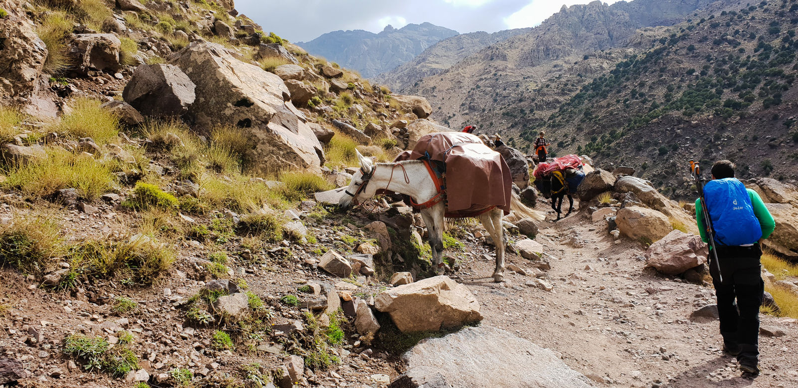 Wir steigen 1 1/3h und ca. 450m in die falsche Richtung auf. Abstieg ins Dorf, knapp 15Uhr - Aufbruch auf der richtigen Route 1500hm liegen vor uns. Unzählige Esel und deren Treiber begegnen uns. Tiefe Blicke in die Bergwelt des Atlas entschädigen Mental die Anstrengung. An kleinen Hütten kann man unterwegs frischgepressten Organgensaft kaufen. Entkräftet erreichen wir gegen 19Uhr die Hütte, die wie eine mittelalterliche Festung im rötlichen Fels thront. Zum Abendessen wenig Abwechselung, Couscous Tajine und Fladenbrot. Wir bekommen starke Kopfschmerzen – Bergerfahrung allein hilft nicht zur Akklimatisierung. Marrakech auf 450m und jetzt 3200m in wenigen Stunden waren zu viel. Die Stimmung ist trotzdem gut mit anderen Touris aus Estland und Spaninen.
