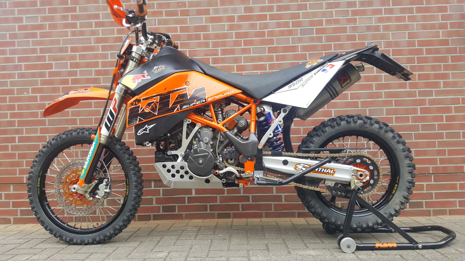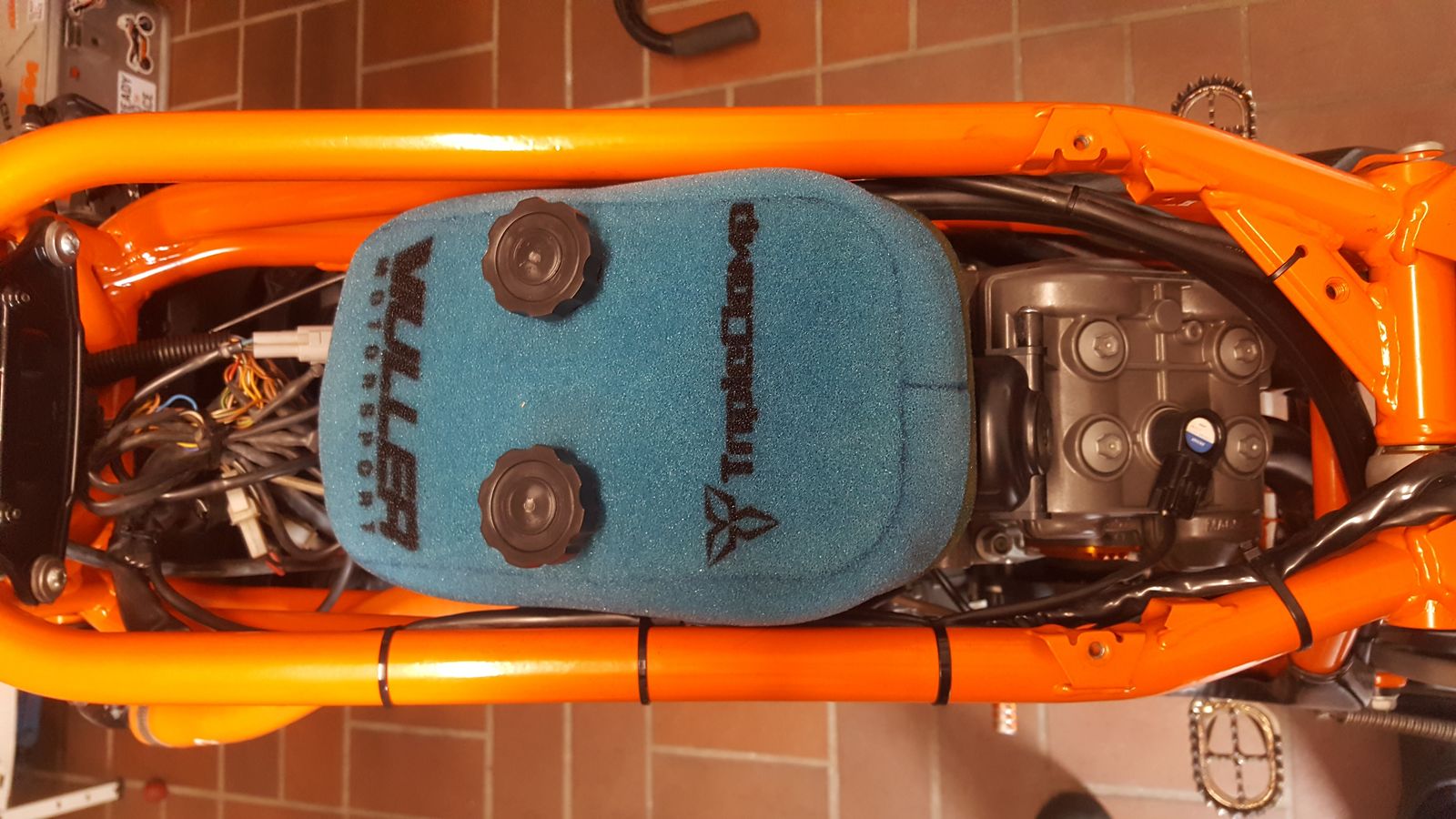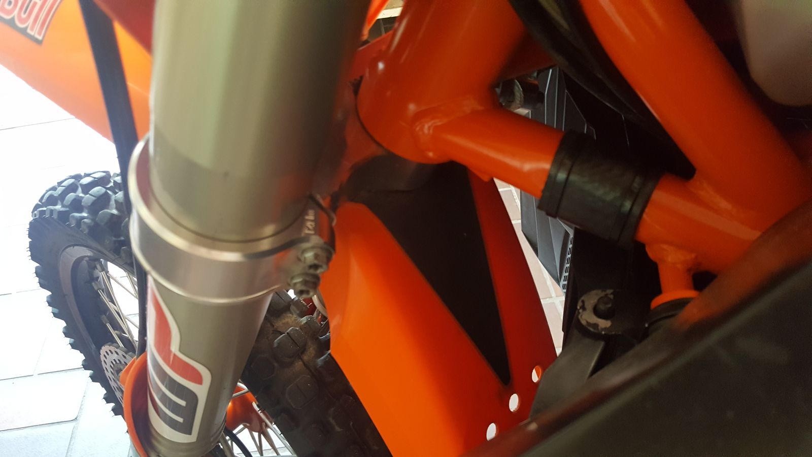 Brauchte nichts geändert werden.Kann auch das Vorderrad meiner EXC so einbauen.....Luftfilter ist von Triple Clamp.Rottweiler hab ich wieder rausgeschmissen....