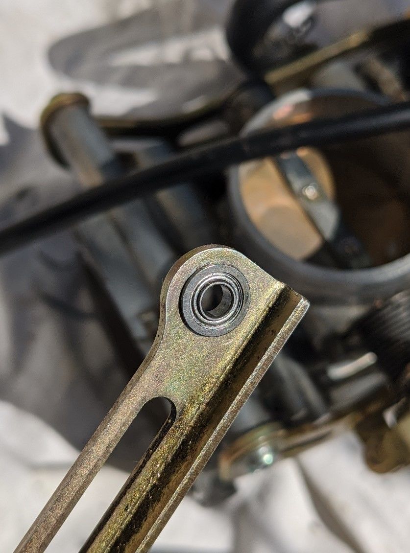 Mir ist aufgefallen, das das Verbindungsblech der beiden Vergaser sehr viel Spiel hatte. Die beiden Messingnieten und die verchromten Achsen an den Vergasern sind sehr abgenutzt. Der ganze Staub geht ja auch außen an den Vergasern vorbei.
