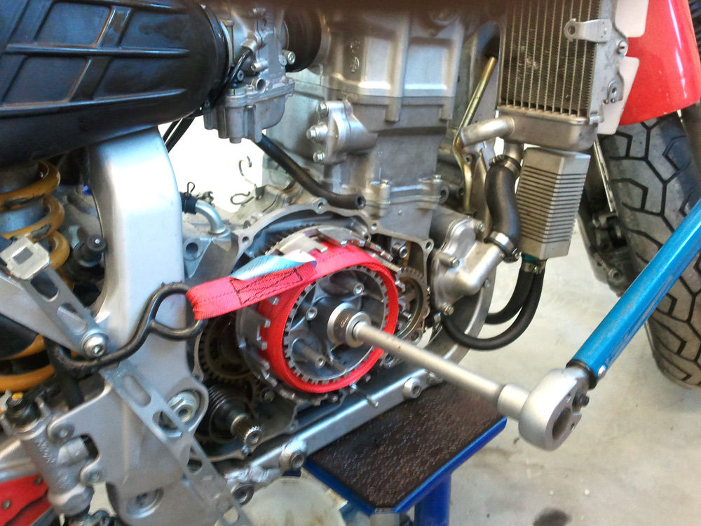 Wie versprochen, hier ein kleines Update. Gestern hab ich die Kupplung so weit außeinandergenommen wie es geht, ohne den halben Motor aufzumachen. Wie erwartet, hat sich die große Mutter als äußerst zäher Gegner erwiesen. Am Ende des Tages konnte ich sie nur mit einem Schlagschrauber, Getriebe in hohem Gang und meinerselbst auf dem Bremspedal stehend lösen...