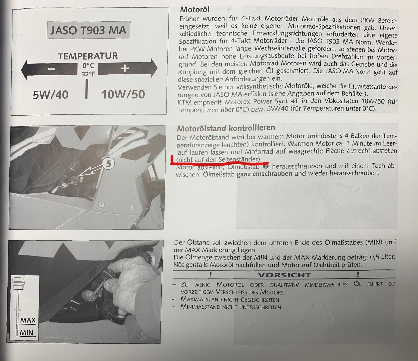 - Verläuft der Boden zur Seite hin schräg abfallend, steht auf dem Hauptständer auch das Öl schräg im Behälter. Die Maschine muß aber für die Messung genau in der Senkrechten stehen!