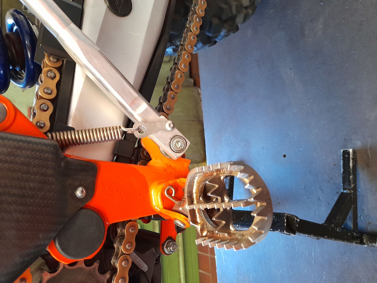 Einen EXC Seitenständer habe ich dran. Nicht angeschweißt. Habe ich mich nicht getraut. Habe eine Halterung ähnlich wie bei der Seitenständerverlegung gebaut. Ein Bild stelle ich noch ein.