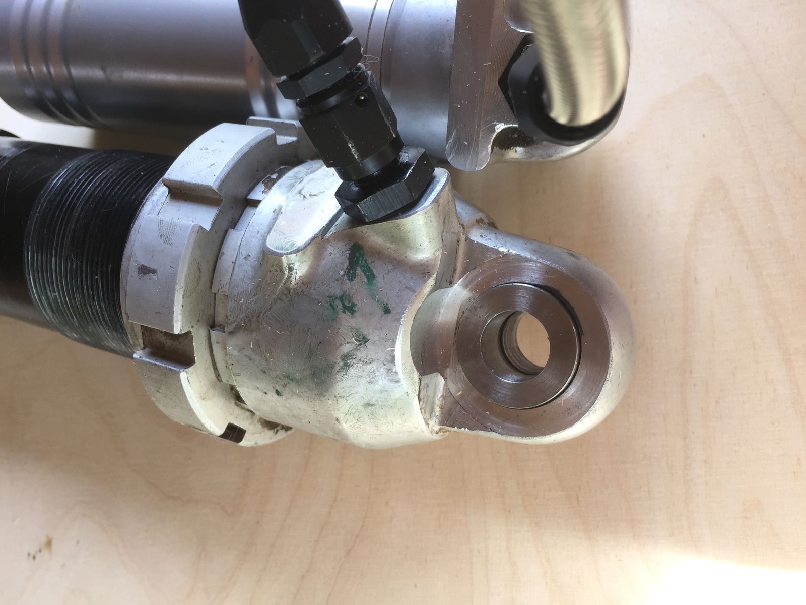 Um den Ausgleichbehälter "daheim" mit Stickstoff befüllen zu können, habe ich noch ein Ventil gesetzt (von einem Rock shox Fahrraddämpfer, knapp 10€)