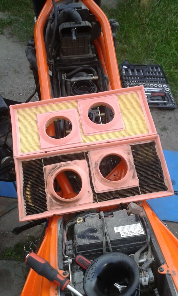 Wenn ich bei Touren damit rechnen muss, dass es recht staubig wird, montiere ich den Uni-Vorfilter anstelle des Ansaugschnorchels. Ich habe ihn vor Jahren von einem Kumpel erstanden und ich finde, er leistet echt gute Hilfe. Der gröbste Dreck wird dort schon abgefangen und schont somit den serienmäßigen Papierluftfilter. Nach der Demontage des Handschuhfaches ist er leicht zu erreichen. Die Reinigung und das Ölen erfolgen adäquat zu den üblichen Schaumstofffiltern. Bei meiner EFI macht das auch keine spürbaren Probleme, wie ein Vergaser reagiert kann ich nicht sagen.