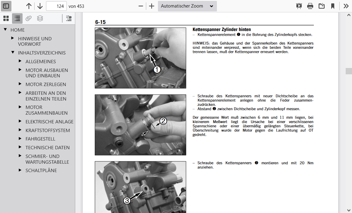 Wenn noch nicht geschehen, solltest Du als Erstes den Verschleiß der beiden Steuerketten messen. Anleitung anbei. Wenn diese an der Verschleißgrenze von 6mm - am Spanner gemessen - oder kurz davor sind, kannst Du bei Deinem 2003er Modell die oben angegebenen, längeren Verschlußschrauben auf die Spanner setzen. Das hat KTM so vorgesehen. Dadurch gewinnst Du ca.2mm an Ausrückweg der Spanner und die Steuerketten haben wieder Betriebsspannung. Wenn nicht, schlackern sie hin und her und die Steuerzeiten verschieben sich mal mehr mal weniger, was zu Problemen im Motorlauf führt. Sind die Ketten aber schon bei ca. 4mm Restweg am Spanner angelangt, bringen die längeren Verschlußschrauben auch nichts mehr und die Steuerketten/Spannschienen müssen erneuert werden.