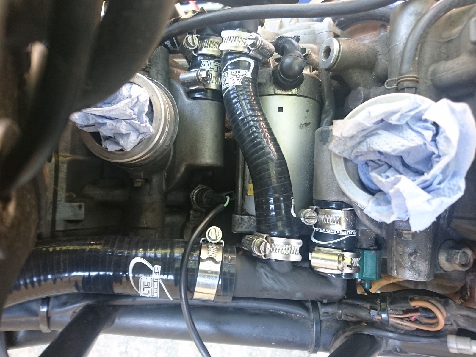 Einige Zeit später und um einige Kratzer und verbogene Finger reicher hab ich auch die rechte Seite erfolgreich installiert. Hab dabei den Kühler und den Öltank gelöst, um etwas Montageraum zu bekommen. Dabei fielen mir dann ein paar Tropfen Kühlflüssigkeit auf, die hinterm Öltank raus kamen.