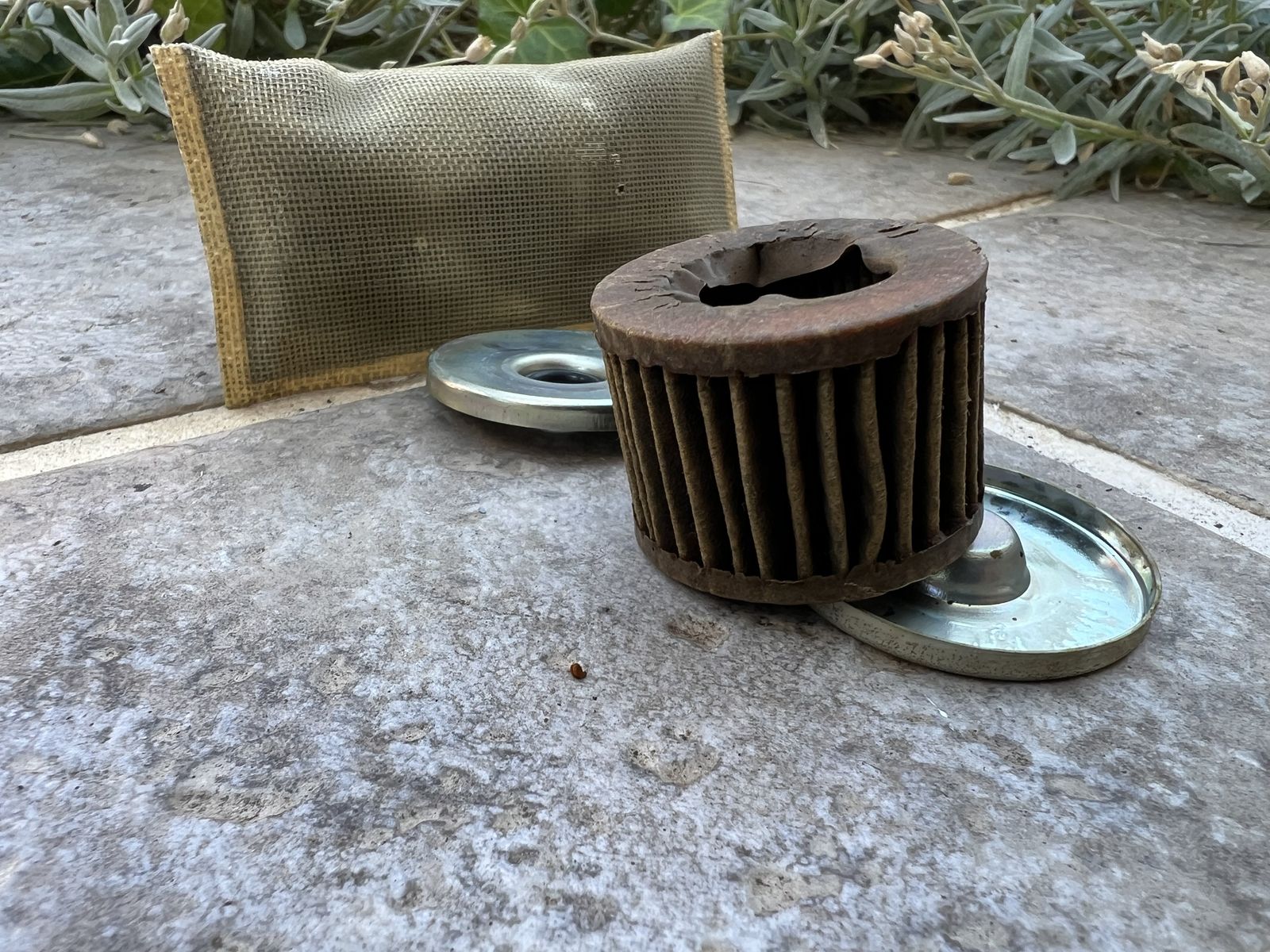 Sa alles ziemlich sauber aus, nur der runde Filter sah etwas in die Jahre gekommen aus. Die Blech Deckel waren nach dem raus nehmen abgefallen. Bezinhahnfilter waren einwandfrei sauber.
