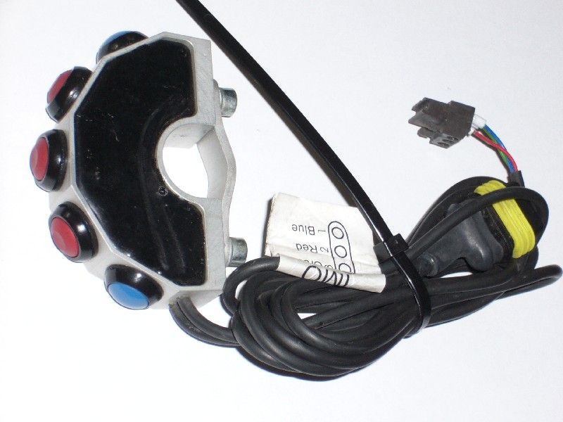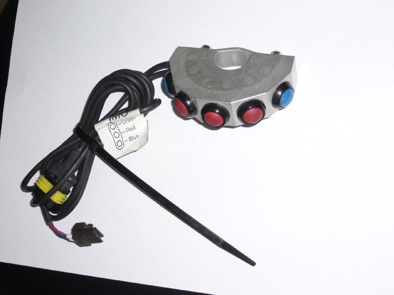 Alu-Gehäuse, 5 Druckschalter wasserdicht (3 rote für einen Imo und zwei blaue fürs Roadbook), passt mit 22 mm Breite auf den LC8-Lenker neben die linke Armatur, war ein Jahr an meiner 950 in Gebrauch,