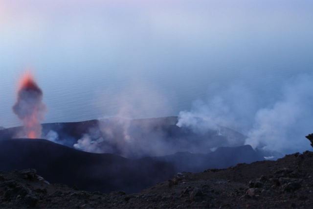 Wir konnten bei gutem Wetter, trotz starker vulkanischer Aktivität, mit Führer auf den Stromboli steigen. Nach den schweren Ausbrüchen 2003 war das lange Zeit nicht mehr möglich gewesen - wir waren eine der ersten Gruppen, die wieder bis auf den Gipfel durfte. 3 Stunden Aufstieg von Meereshöhe auf 950m am späten Nachmittag. Dann erreicht man den Gipfel: 200m unter dir liegen die aktiven Krater. Alle paar Minuten wird Lava ausgestossen - normalerweise 20-40m hoch - wir hatten 2 Explosionen, die knapp 200m hoch waren..... Ein unglaubliches Erlebnis!!!! 1 Stunde bleibt man oben bleiben, dann gehts in der Dunkelheit mit Taschenlampe wieder runter.