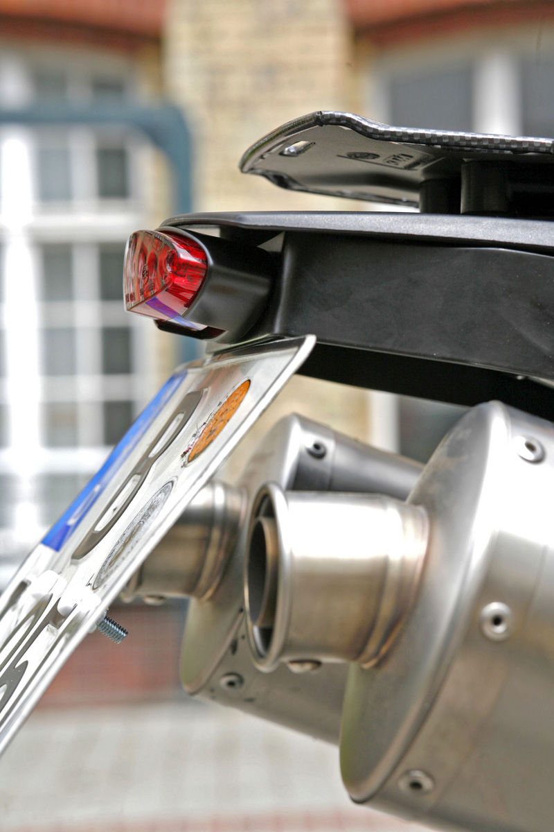 Befestigt ist die Platte an den Blinkern und an der Befestigungen für die Auspuffanlage.