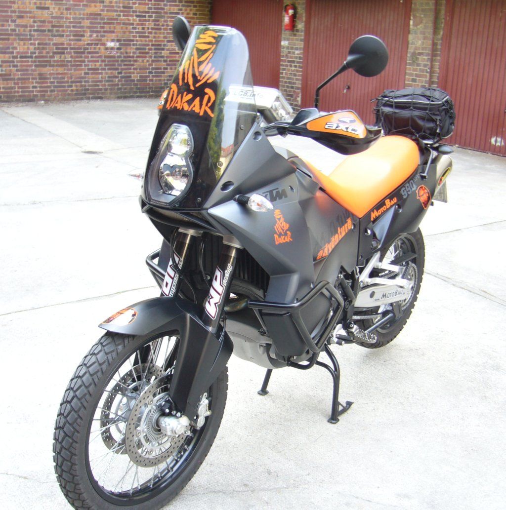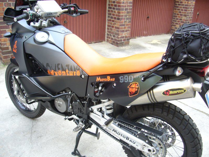 In halborange mochte ich die 990er nicht. Für die Blaue bin ich zu kurz und die mattschwarze Version war mir zu langweilig. Deshalb die Aufkleber und meine alten Sitzbank in orange. Die meisten Aufkleber sind von Motobau. Die Dakar-Symbole sind von der Stickermafia. Aber Aussehen ist ja sowieso Geschmackssache...