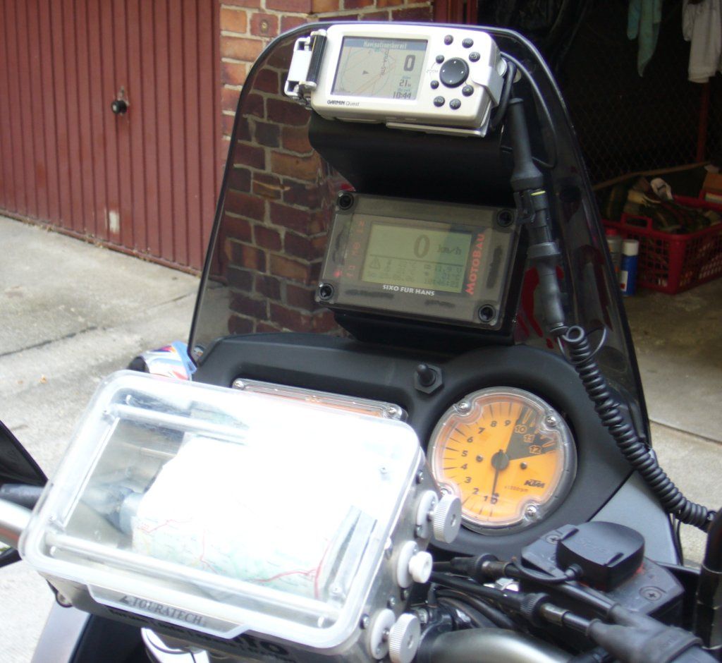 Die Firma Motobau hat das Cockpit umgebaut. Die Halterung über dem originalen Cockpit trägt meinen Quest und den Sixo. Der Sixo sollte ursprünglich nur als Tripmaster arbeiten. Jetzt hat er die Motobau-Software und bekommt alle Signal parallel zum originalen Cockpit. Er zeigt Geschwindigkeit, Uhrzeit, Öl-, Luft- und Kühlwassertemperatur, Batterieladung, Drehzahl, zwei Tageskilometerzähler, Kilometer seit dem letzten Tanken, Rundenzähler mit Laptimer (o.k., das brauche ich nicht wirklich, ist aber Teil der Software ), Betriebsstunden, Schaltblitz, Tripmaster etc. Bedienen kann ich ihn vom Lenker aus, zusammen mit dem Roadbookhalter auf dem Lenker. Der Kippschalter im Cockpit ersetzt den nicht mehr vorhandenen Lichtschalter.