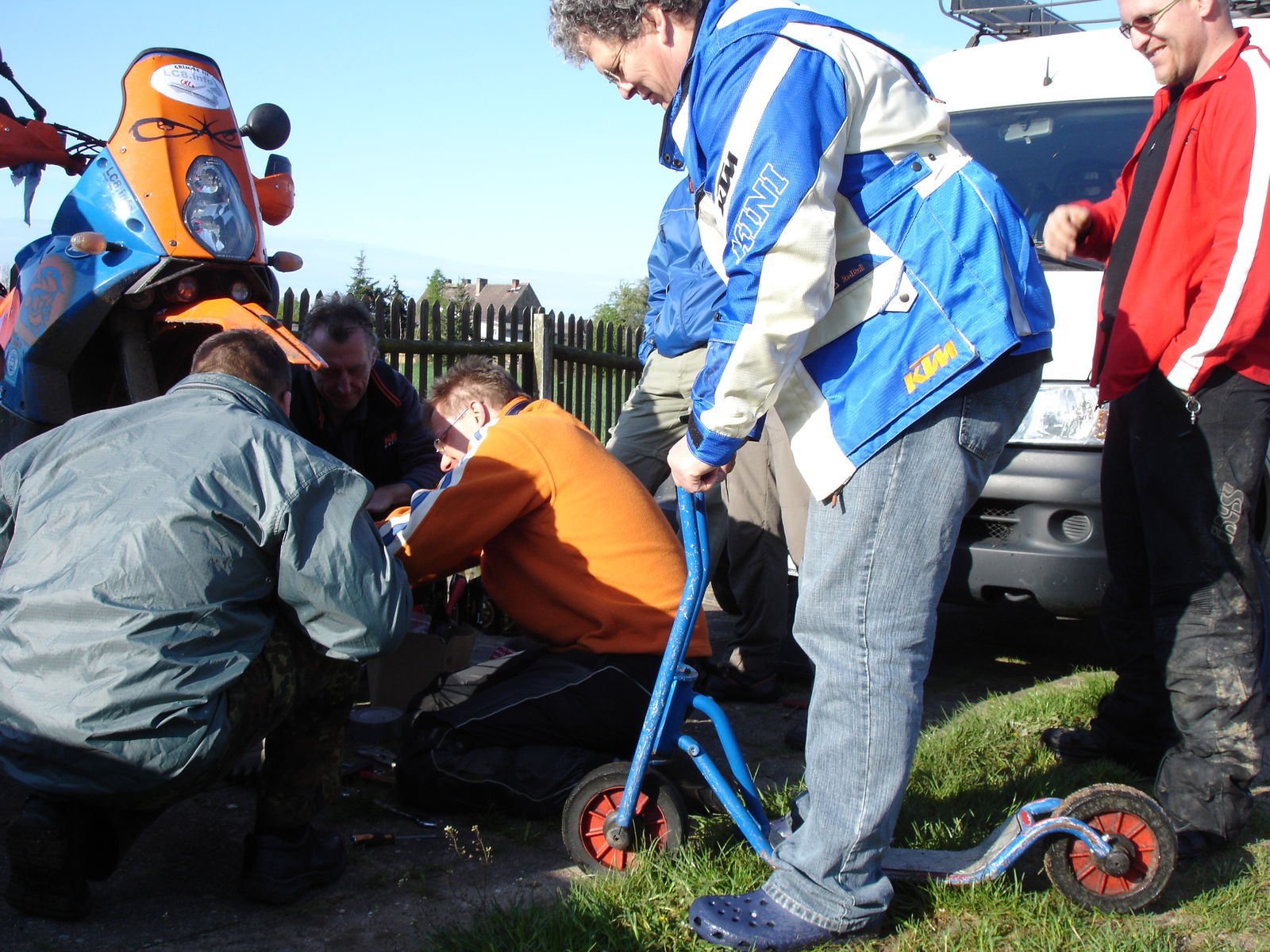 naja nich so ganz ,in Grimme ware der 4 Kolben undicht und wir haben am 2.Mai vor dem Start auf einem EXC 2-Kolben (Danke an BRB) mit Spacer und 300er Scheibe umgebaut - konnte fahren und hat sogar gebremst -die abgedrehte aches bekam eine ´1" Heizkörprdichtun verpasst - geht Exclamation