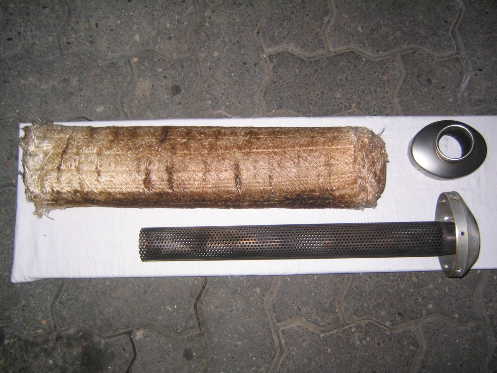 Ich war erstaunt in welchem außerordentlich guten Zustand das Dämmmaterial nach etwas über 30.000 km war. Leicht rehbraun und immer noch flexibel und weich, kaum „verglast“. Aber noch mehr war ich erstaunt über die Inneren Werte. Das „ordentliche“ zusammenheften des Innenrohres, ein gerade abgetrenntes Innensiebrohr und das noch drehend gelagert. An den einzelnen Bauteilen konnte man keine unkontrollierte Ausgasung in Form von Rußstellen erkennen. Alles dicht.