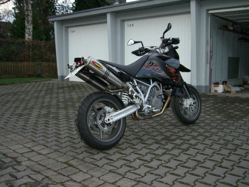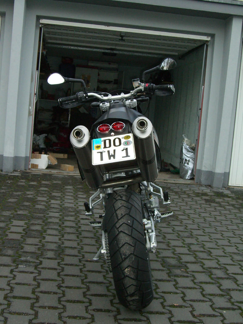 hi, bin der carsten aus dortmund...habe mir vor 2 jahren die xt660x gekauft und mußte feststellen das sie leider nicht genug leistung für das gewicht hatte....dann habe ich mich hier mal ein wenig angefixt mit der droge 950sm...habe die xt an die sonne getan und blind (ohne probefahrt und ohne einmal drauf gesessen zu haben) ne 06er bestellt...dachte mir sind ja ca die gleichen angaben wie bei meiner alten nur halt doppellte leistun...gemacht getan...habe sie im januar (vor 5 tagen) abgeholt und auseinandergebaut...akra drann, 16er ritzel, heckumbau, luftfilter gefenstert, griffschalen drann...bei den blinkern weiß ich noch nicht so genau, werden wohl die kellermann rhombos...habe zwar schon drauf gesessen aber immernoch keine runde gedreht....bin schon richtig heiß.... ;-)
