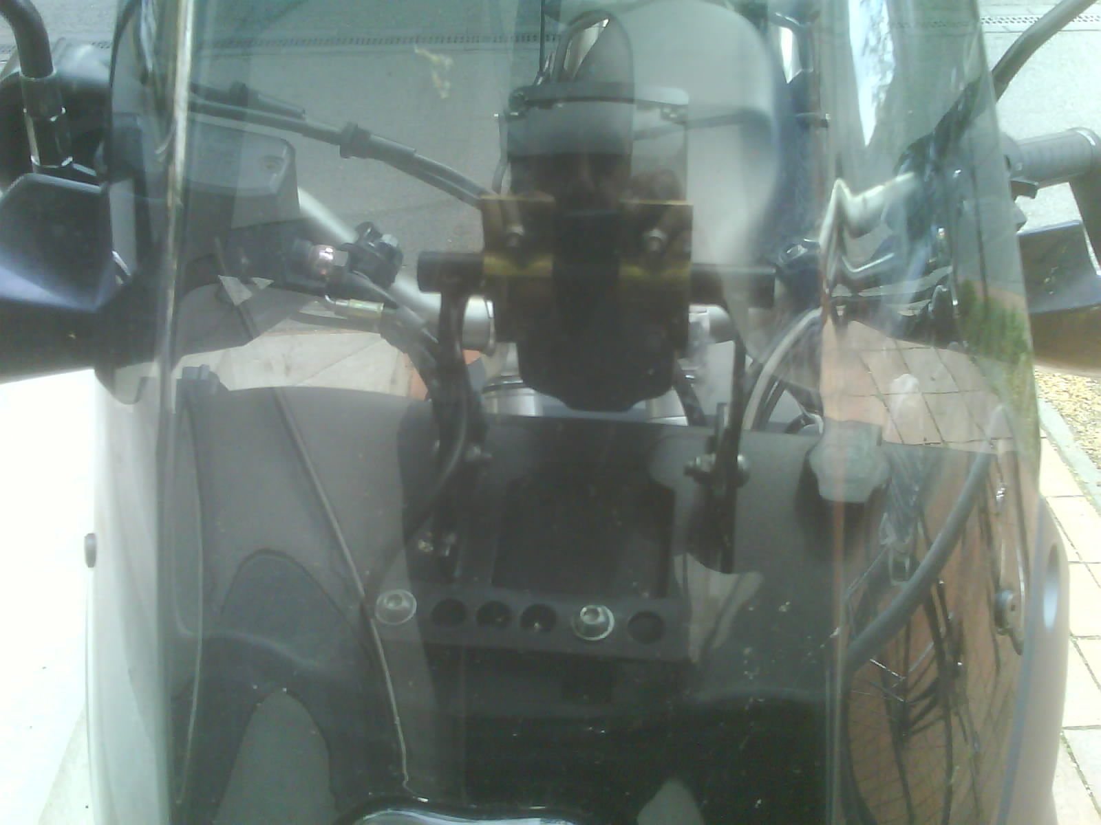 Als Halterung habe ich den Standard Touratech GPS Anbau ein wenig modifiziert, nicht mehr waagerecht, sondern nur mit zwei Schrauben schräg nach oben. Siehe Bilder.