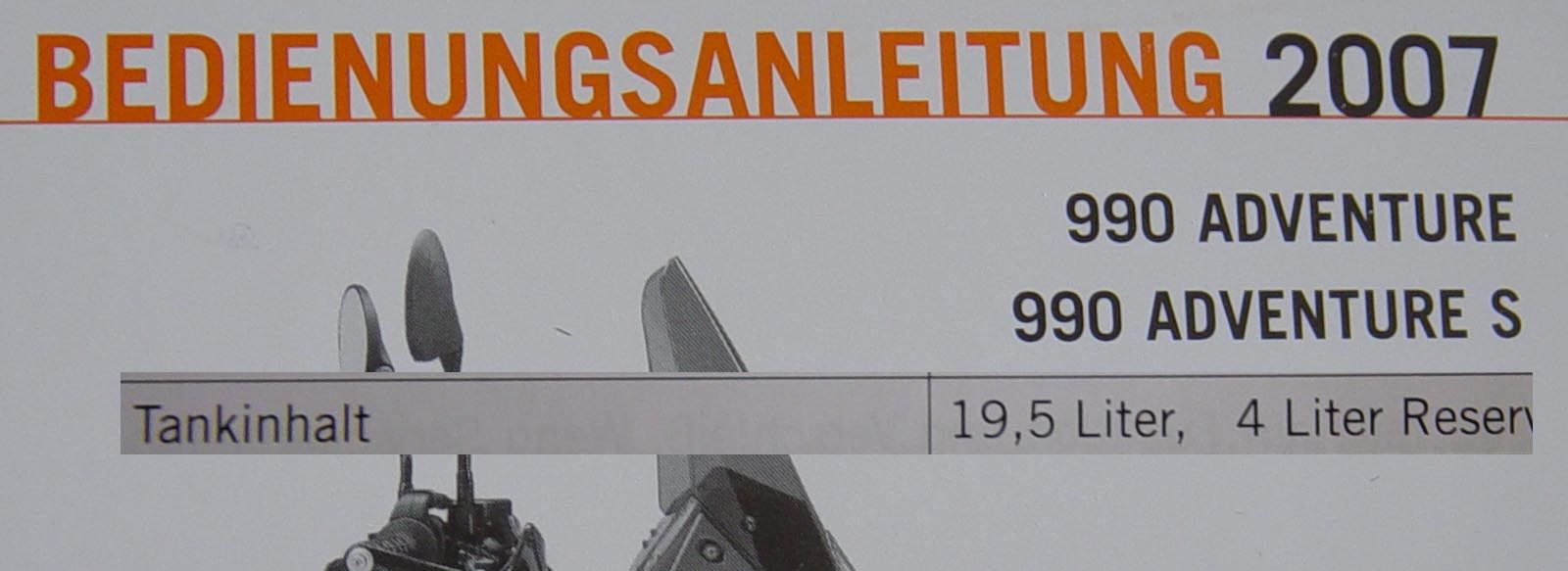 Das Problem, zumindest bei *meiner* 2006er 990 N, besteht darin, daß ich die 21 L nicht ausnutzen kann. Wenn das Meppel mit scheinbar leerem Tank stehenbleibt, kann ich max. 19,5 L tanken (mit Kanister hintendrauf ausprobiert).